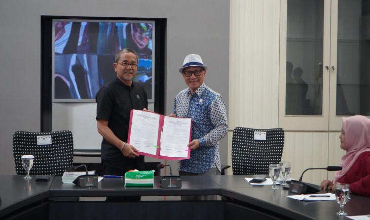 Kepala Dinas Pariwisata dan Kebudayaan Jawa Barat Benny Bachtiar (kiri) bersama Ketua Tim WBTB Jawa Barat Bucky Wibawa Karya Guna saat pengumuman 42 karya budaya menjadi WBTB, di Kota Bandung, Kamis (9/1/2025).