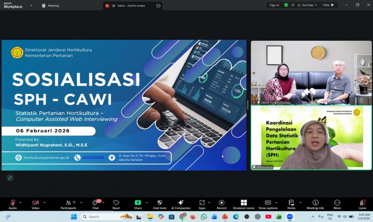 Kegiatan interaktif ini menghadirkan Widhiyanti Nugraheni, Statistisi Ahli Madya Sekretariat Direktorat Jenderal Hortikultura, sebagai narasumber utama, didampingi Edi Puspito, Penyuluh Pertanian Ahli Madya. Diskusi dipandu moderator Feby Suci Ramadhany yang menjembatani dialog antara pusat dan daerah.